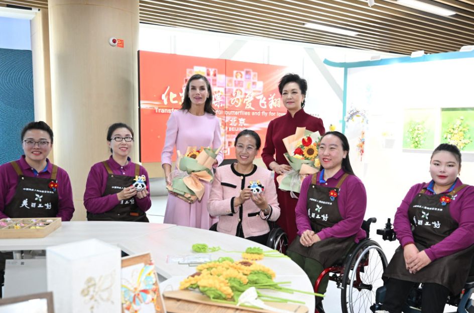 11月12日上午,国家主席习近平夫人彭丽媛和陪同西班牙国王费利佩六世来华进行国事访问的王后莱蒂西娅参观北京市残疾人服务示范中心。